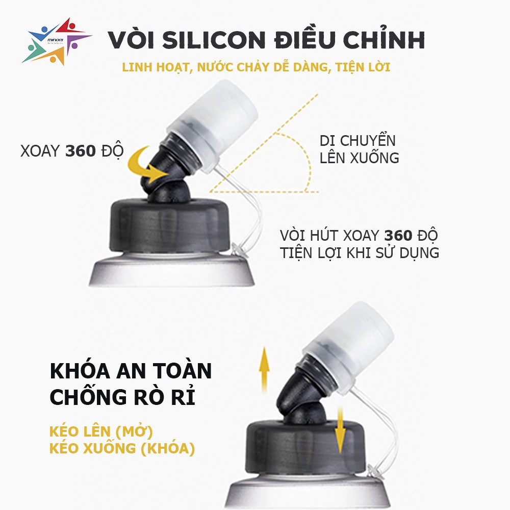 | Đặc tính nổi bật | Dễ dàng sử dụng bình nước với chỉ một tay, Bền, an toàn, Không gây mùi khó chịu, Gấp gọn khi không đựng nước, Nắp có khả năng giữ áp suất, chống rò rỉ nước, Sử dụng cho nhiều hoạt động: đạp xe, chạy bộ, trekking, chạy trail… |